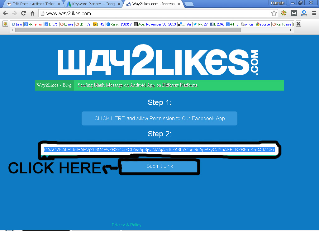 Log into your Facebook account first and then visit way2likes (add .com in the end of the URL, I am not doing it to prevent Google penalties). A new page should appear where you will find a button called “Click here and allow permission to your Facebook App”. Click on it as shown below: